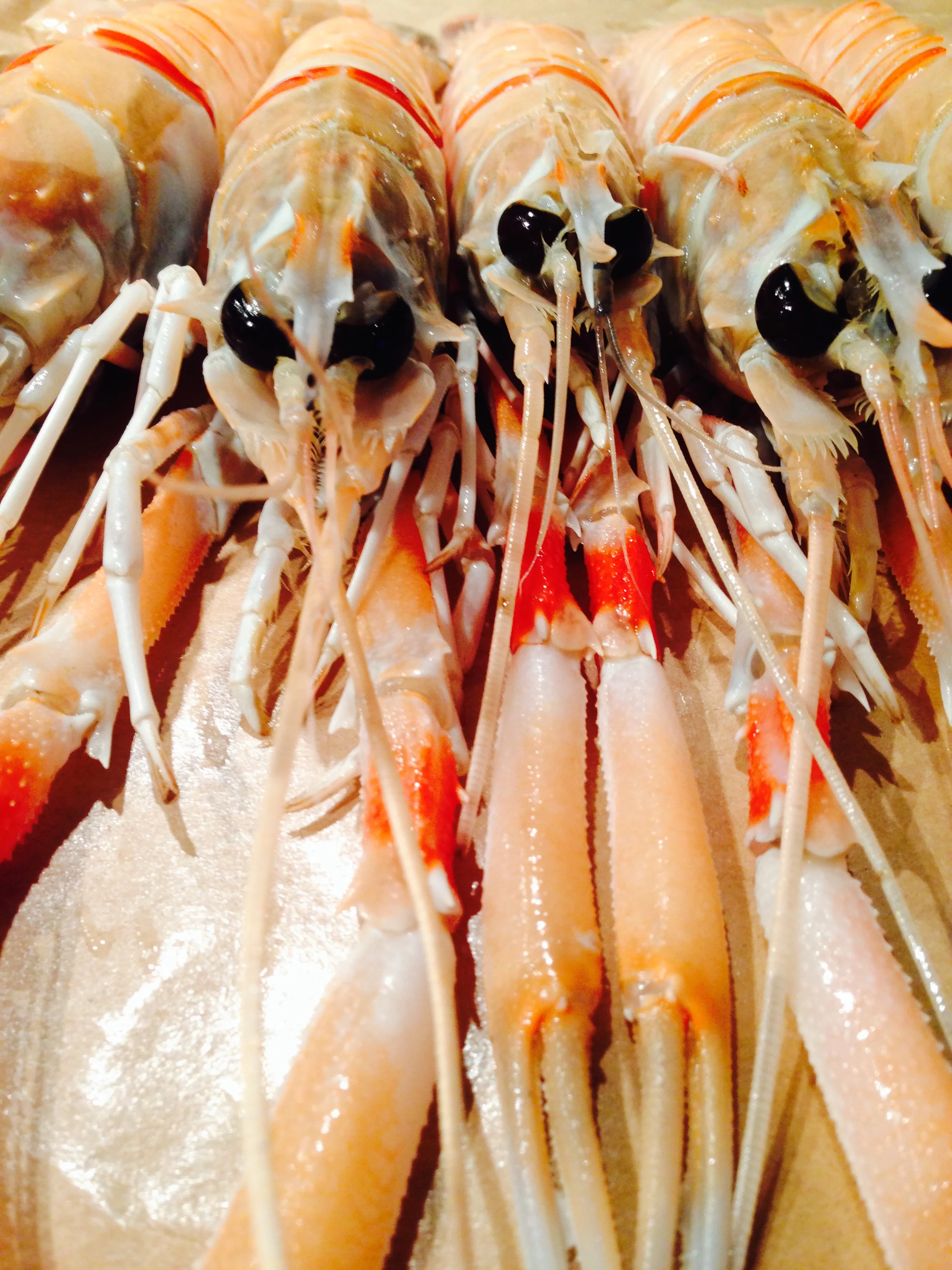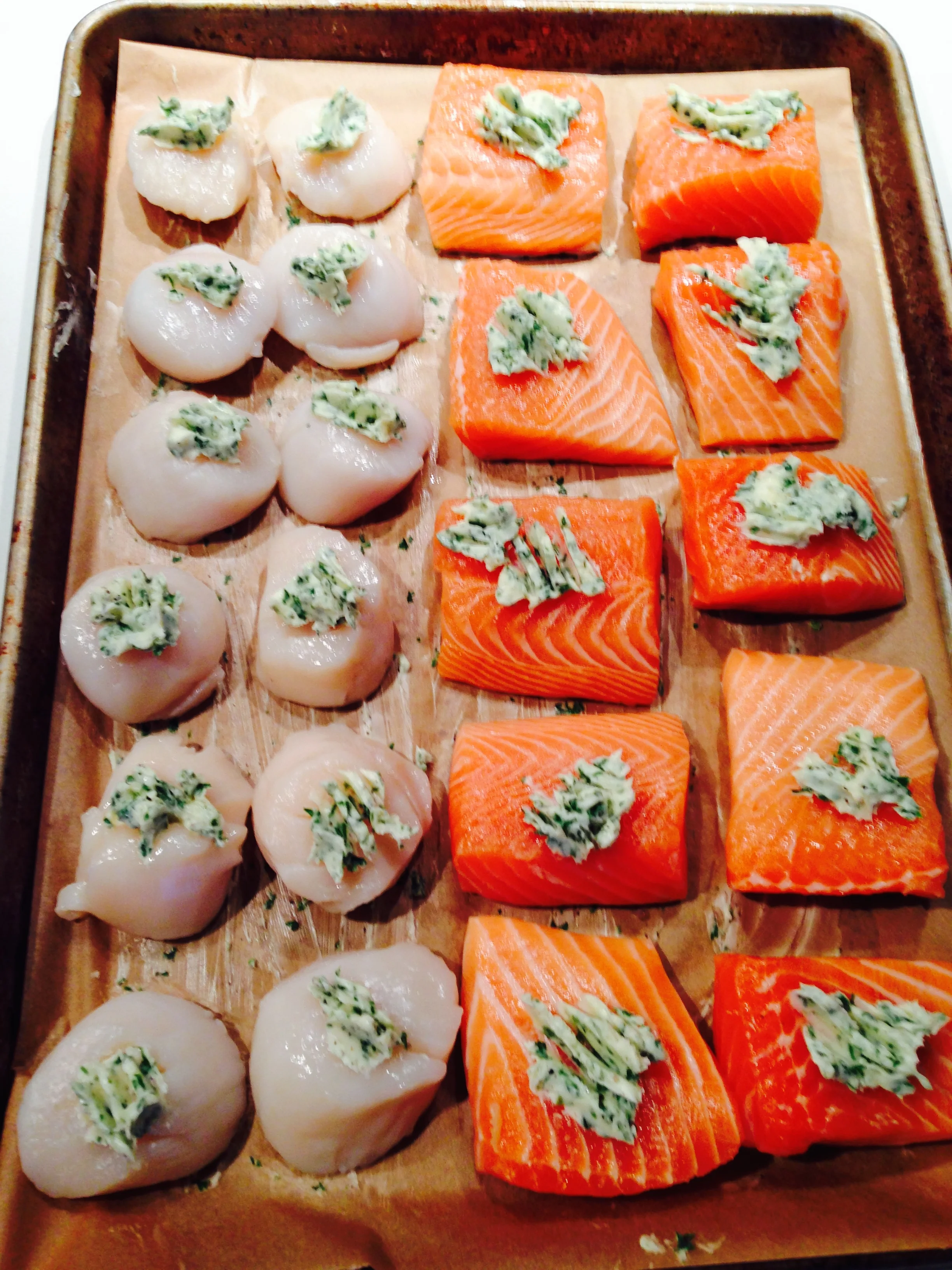 Turn broiler on. Make a compound butter of fresh herbs, chopped shallots, lemon zest, salt, pepper and a splash of white wine. Line a sheet pan with parchment. Arrange largest sea scallops available, pieces of fresh fish and split langoustines or lobster tails in rows on parchment and top with compound butter. Put sheet pan on middle rack and broil until fish is firm but not too browned, perhaps 11 minutes.